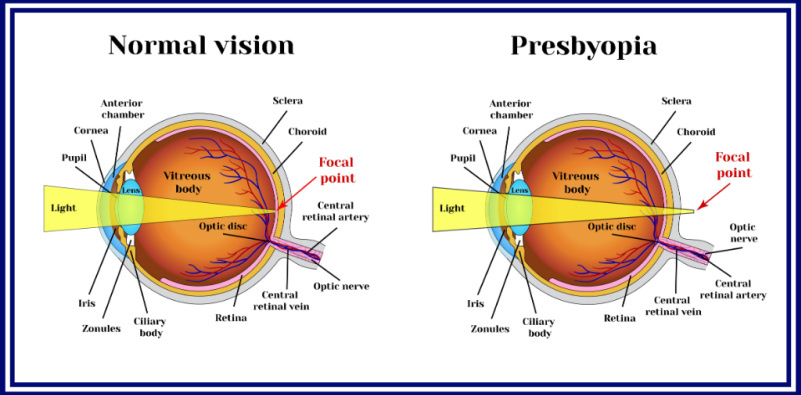 Presbyopia is very normal and the most common of eye problems with age. It affects everyone and is the reason many older people need to wear reading glasses. In technical terms, it is a refractive error that occurs because the lens, the part of the eye that helps you focus, becomes less flexible. This stops it from being able to change shape and focus light correctly on the retina at the back of the eye. The result is that close-up objects start to appear out of focus as you get older.